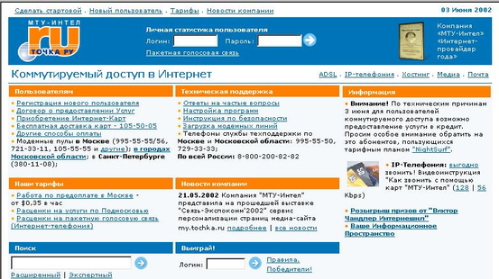 Фактически, компания «МТУ-Интел» предоставляет коммутированный доступ в интернет. И точка. Но точка-то, как выяснилось, не простая. А «Точка.Ру »! А это уже является проектом того же MTU с целью расширения целевой аудитории компании. А сюда уже входит гораздо более широкий спектр услуг: