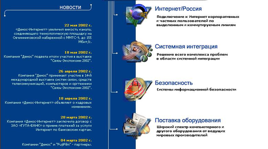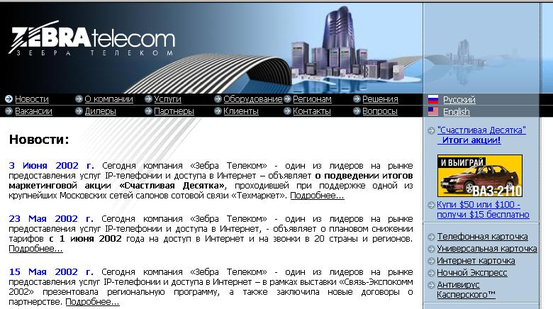 Нельзя точно обрисовать круг услуг компании… это, в первую очередь все еще, наверное, коммутируемый доступ в Интернет, а потом… тут тебе и развлечения, и новости изо всех уголков мира, и возможности поиска, и рефераты, и знакомства… Теперь это не просто образцовый провайдер, а развлекательный портал именно, сравнимый, к примеру, с ОМЕНом (который, судя по характерным признакам, тоже давно в одной упряжке с Golden Telecom)…