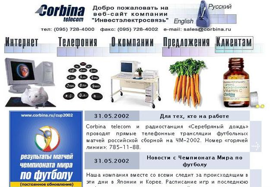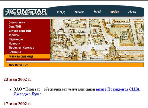 Сразу, что получаем при посещении сайта – ожидание. Приходится довольно долго подождать, прежде чем загрузиться вся картинка. О том, что на главной странице содержаться новости, не имеющие прямого отношения к основному роду деятельности компании – это еще полбеды; ну согласитесь: только истинным и преданным клиентам компании будет интересно узнать, что «Команда Комстар по боулингу - чемпион турнира "Связь 2002" », а также перечитывать «свежайшие» новости от февраля месяца… Картинки при переходи по страницам практически каждый раз новые, включая панель выбора языка/кодировки страницы и основное меню. К тому же картинки не кэшируются.