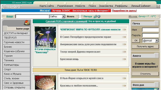 Раньше ROL не отличались ни дизайном, ни информативностью. Дизайн был довольно прост и теперь я понимаю, что это было хорошо. Теперь кликаешь ссылку провайдера – попадаешь на развлекательный портал. Нельзя сказать, что дизайн плох, но всё-таки страница очень перегружена, места свободного нет. Конечно, я не говорю о том, что пусть 50% пространства будет свободным, просто для верного восприятия необходимо давать глазам отдых. Вместе с системой Aport Golden Telecom (ROL) пытаются сотворить что-то мега невообразимое. Помнится, этот провайдер позиционировал себя на MTV как провайдер для молодёжи… Результат очевиден, так как всё-таки большая часть клиентов – студенты, подростки, которые «играют в сетевые игры», «скачивают рефераты» и «общаются в чате, узнавая много нового».