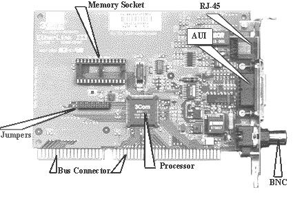 Адаптеры Ethernet представляют собой плату, которая вставляется в свободный слот материнской (системной) платы компьютера. Из-за широкого распространения компьютеров с системной магистралью ISA существует широкий спектр адаптеров, предназначенных для установки в слот ISA, а также производятся адаптеры, совместимые с шиной. Чаще всего адаптеры Ethernet имеют для связи с сетью два внешних разъема: для коаксиального кабеля (разъем BNC) и для кабеля на витой паре. Для выбора типа кабеля применяются перемычки или переключатели, которые устанавливаются перед подключением адаптера к сети.