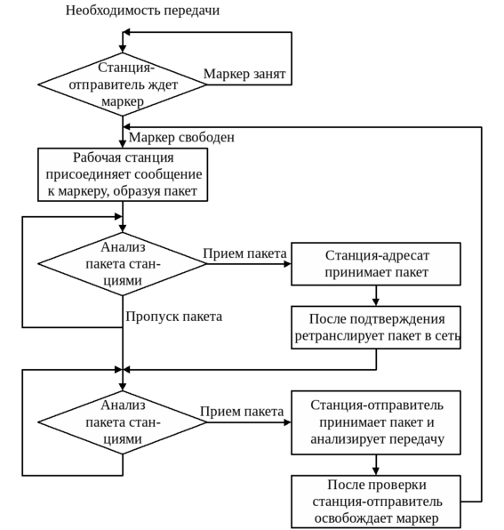 Каждый узел принимает пакет от предыдущего, восстанавливает уровни сигналов до номинального уровня и передает дальше. Передаваемый пакет может содержать данные или являться маркером. Когда рабочей станции необходимо передать пакет, ее адаптер дожидается поступления маркера, а затем преобразует его в пакет, содержащий данные, отформатированные по протоколу соответствующего уровня, и передает результат далее по ЛВС.