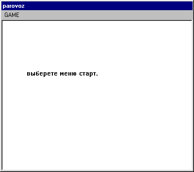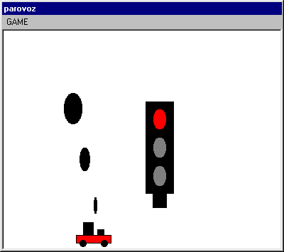 После запуска игры, на экране появляется окно с надписью «выберите пункт старт». Окно имеет меню, состоящее из нескольких пунктов. С помощью пунктов меню можно: изменять цвет движущегося объекта (паровозика в красный, синий, зелёный), начать (перезапустить), осуществить выход из игры. После выбора пункта меню «старт», в левом нижнем углу окна появляется паровоз, представляющий собой совокупность геометрических фигур – эллипсов (колёса) и прямоугольников (кабина, трубы). Паровоз движется слева направо и останавливается перед светофором, расположенным приблизительно в середине окна над паровозом. Пользователь имеет возможность регулировать цветом светофора нажатием клавишь ‘к’, ‘з’, ‘ж’, соответствующим цветам светофора – красному, зеленому, жёлтому. Если паровоз подъезжает к светофору, а у светофора активным является зелёный цвет, он продолжает своё движение. В противном случае, паровоз останавливается. При достижении правой стенки, паровоз появляется у левой стенки, а активным цветом светофора становится жёлтый цвет. Из верхней части паровоза постоянно поднимаются в верхнюю часть окна окружности, представляющие собой клубни дыма, которые увеличиваются при подъёме.