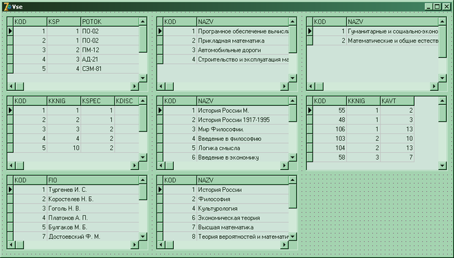 В этой форме заголовки столбцов в таблицах показываются «как есть», в отличие от всех предыдущих форм, где заголовок задавался на этапе проектирования – для удобства и наглядности. DBGrid’ы связаны с наборами данных, расположенными на поверхности формы DM, которая имеет тип DataModule.