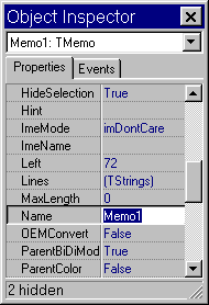 | Окно отражает поведение данного компонента для текущей формы Form1. Состоит из двух страниц (вкладок). Страница Свойство (список свойств) отображает информацию о текущем компоненте. Страница События (список событий) определяет процедуру, которую компонент должен выполнить при возникновении указанного события. | Если нужно изменить что-нибудь, связанное с определенным компонентом, то это выполняется в Инспекторе Объектов. К примеру, можно изменить имя и размер компонента Tlabel , изменяя свойства Caption, Top, Height и Width. Страница событий связана с Редактором кола. Страница Свойство при проектировании формы позволяет просто изменять свойства компонентов, что отражается в окне проектировщика форм. Если для какого либо События существует процедура, то в разработке процедура выполняется автоматически при возникновении этого события. Такие процедуры служат для обработки событий, поэтому их называют обработчиками. Каждый компонент имеет свой набор свойств и событий, определяющих его индивидуальность и особенности. |