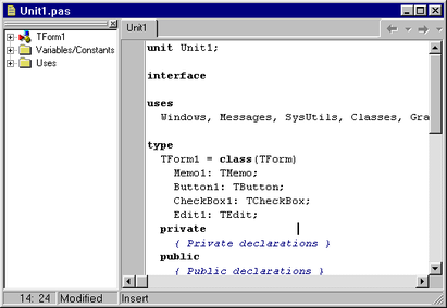 | Первоначально имеет заголовок Unit1.pas. Окно редактора содержит исходный текст модуля разработки. Редактор и форма тесно связаны между собой (переключаться между ними можно клавишей F12). В Окне Проводника кода отображаются объекты модуля формы, что позволяет быстро обращаться к объектам и создавать новые классы. Окна в Delphi могут стыковаться друг с другом с помощью мыши, сливаться в одно общее окно, разделенное на несколько частей. | Редактор кода представляет собой обычный текстовый редактор, с помощью которого можно редактировать текст модуля и другие текстовые файлы приложения. В редакторе кода можно открывать несколько файлов, каждый из которых размещается на отдельной странице. Между страницами можно переключаться мышью, т.е. "листать" файлы по ярлычкам. Окно Проводника кода размещается слева от окна Редактора. В нем в виде дерева отображаются все объекты модуля формы, например переменные и процедуры. В окне ПК удобно просматривать объекты приложения и можно быстро обращаться к необходимым объектам, что особенно важно при работе с большими модулями. ПК автоматизирует создание новых классов. При закрытии файла закрывается и ПК. Проводник кода можно убирать и выставлять с помощью команды меню Вид. Окна удобно перемещать по экрану и изменять их размеры. |