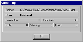 | В процессе компиляции проекта создается: Имя приложения совпадает с именем файла проекта. Само приложение является автономным. Запуск процесса компиляции выполняется по команде Project /Compile Компиляция может быть выполнена на любой стадии разработки проекта. При компиляции происходит: которых изменилось после последней компиляции. В результате создается файл с расширением *.DCU; изменения и модулей, использующие его с помощью директивы uses. Ход процесса компилирования будет отображаться на экране, если установить опцию Show compiler progress в меню Tools/ Environment Options/ Preferences. Сборка проекта выполняется командой Project /Bild . При сборке перекомпилируются все модули, входящие в проект, не зависимо от того, были в них внесены изменения или нет. Запускать проект можно из: -