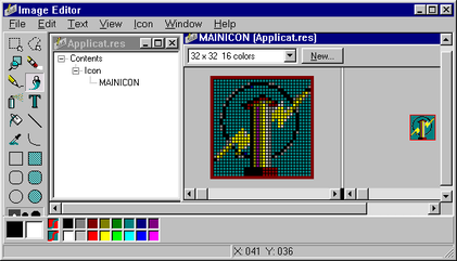 Курсоры (*.CUR). | Эти компоненты являются ресурсами Windows, поскольку они разработаны в соответствии со стандартами этой системы. На рисунке показано окно редактора, в которое загружен файл и выполняется редактирование пиктограммы приложения. Файл ресурсов имеет иерархическую структуру, в которой ресурсы разбиты на группы, а каждый ресурс имеет уникальное в пределах группы имя. Имя ресурса задается при его создании и в последующем используется в приложении для доступа к этому ресурсу. Программа проекта находится в группе Icon и по умолчанию имеет имя MAINICON. |