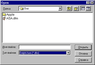 В диалоговом окне ( ДО ) Open (Открыть) в списке типов файлов найти и установить маску *.dfm; -