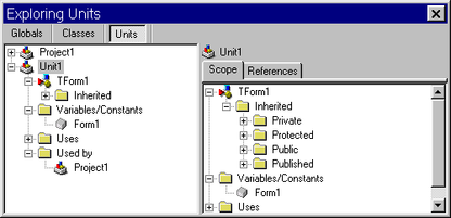 С помощью обозревателя проекта можно перебирать используемые программой модули и просматривать символы в разделах interface или implementation; можно перебирать глобальные символы приложения, просматривать их объявления и переходить к ссылкам на них в исходном коде.