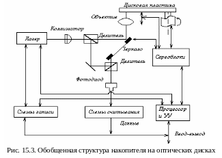 При записи луч полупроводникового лазерного диода, управляемого данными записи через коллиматор, зеркало и линзу объектива прожигает отверстие в информационном слое диска. Наличие отверстия соответствует записи «1». При считывании неуправляемый лазерный луч (получаемый из делителя луча) выходит на рабочую поверхность через другой делитель луча, зеркало и объектив. В режиме чтения зеркало перемещается. Отраженный свет через делитель луча попадает на фотодиод, сигнал с которого обрабатывается электронными схемами считывания. Точная установка луча на дорожке обеспечивается сервоблоком дорожки, фокусировка - сервоблоком фокусировки, а постоянное число оборотов - сервоблоком вращения диска.