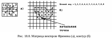 Этот метод основан на выделении контура по алгоритму Фримена с последующей идентификацией контура. Цепной код Фримена позволяет представить контур произвольной формы в виде последовательности коротких векторов (рис. 18.8).