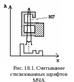 Все ЧА разделяют на оптические (ОЧА) и магнитные (МЧА). Магнитные читающие автоматы ориентированы на чтение стилизованных шрифтов, нанесённых на носитель при помощи специальных магнитных чернил, которые имеют добавки, придающие чернилам ферромагнитные свойства. Для таких ЧА существует таблица стилизованных шрифтов для различных типов считывания. Считывающая магнитная головка (МГ) по ширине превышает высоту символа и с постоянной скоростью перемещается вдоль строки (рис. 18.1).