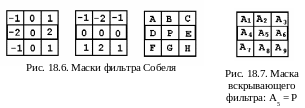 Многие алгоритмы распознавания символов работают на основе распознавания контуров, поэтому контура выделяют фильтром Собеля. Этот фильтр реализуется посредством использования масок 2-х типов (рис. 18.6). Яркость пикселя определяется по следующей формуле