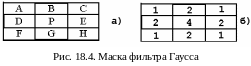 етоды локальных операторов. При использовании данного метода новое значение яркости вычисляется не только на основе старого значения, но и с использованием значений яркости рядом лежащих точек. Самый простейший метод из этой группы - это фильтр Гаусса. Он использует маску типа квадратной матрицы степени 3 (рис. 18.4, а) с весами пикселей (рис. 18.4, б), сумма которых равна 16. Новое значение яркости пикселя Р определяется по формуле