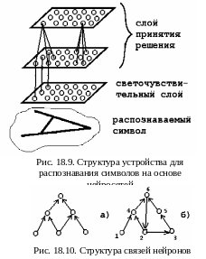 ейросеть (НС) - это большой, сильно взаимосвязанный ансамбль простых элементов. Элементы обычно представляют собой двухуровневые приборы, которые переключаются из одного состояния в другое когда сигнал на входе превышает пороговое значение. Такое направление развивается с 1943 года. Слой принятия решения (рис. 18.9) состоит из нейронов. В нейросетях используются две структуры (рис. 18.10). во второй структуре введены обратные связи. Цепочка 2-3-5-6-2 реализует возвратную активность.