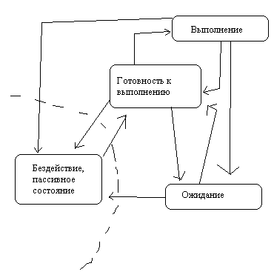 Из состояния выполнения процесс переводится в состояние готовности к выполнению в связи с появлением более приоритетной задачи или в связи с окончанием выделенного этому процессу кванта времени. Либо вследствие запроса операции ввода/вывода, который должен быть выполнен прежде чем процесс может продолжить исполнение либо в силу невозможности предоставить ему ресурс запрошенный в настоящий момент. При поступлении соответствующего сигнала о завершении операции ввода/вывода, освобождающем требуемый ресурс, в оперативную память загружается необходимая страница виртуальной памяти. Процесс деблокируется и переводится из состояния готовности к исполнению. Итак, движущей силой, меняющей состояния процессов, является механизм прерываний.