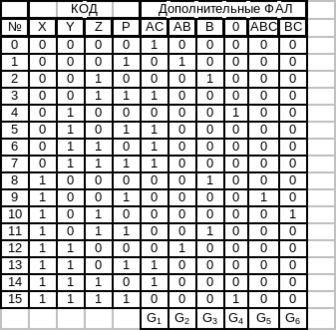 Таблица истинности для выбранных признаков представлена в таблице 2, где ФАЛ - функция алгебры логики, в которых значение 1 принимается для кодов, имеющих значение признака h, равного 1. В общем случае h Ì {0,1}. Следует учесть, что h1àF1, h3àF3, h5àF5.