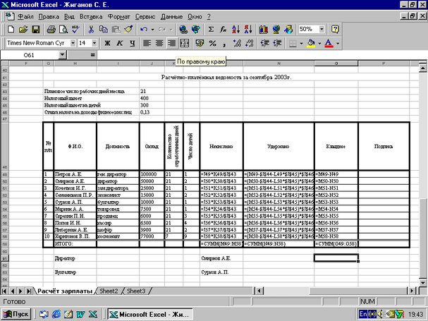 Причем, персональную информацию мы записали в виде таблицы в соответствующие графы. Оставшиеся ячейки мы заполнили расчетными формулами: