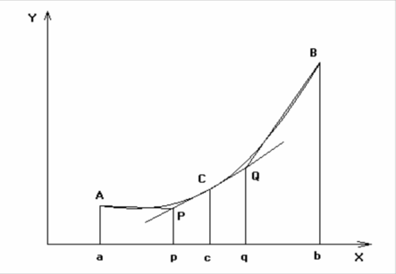 Для этого разделим отрезок [a, b] точкой c = (a + b) / 2 пополам и в точке C(c, f(c)) проведем касательную к линии y = f(x). После этого разделим [a, b] точками p и q на 3 равные части и проведем через них прямые x = p и x = q. Пусть P и Q – точки пересечения этих прямых с касательной. Соединив A с P и B с Q, получим 3 прямолинейные трапеции aAPp, pPQq, qQBb. Тогда площадь трапеции aABb можно приближенно посчитать по следующей формуле