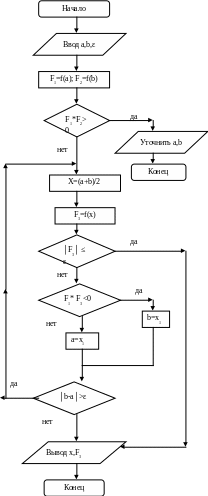 Метод половинного деления или дихотомии (дихотомия - сопоставленность или противопоставленность двух частей целого) при нахождении корня уравнения f(x)=0 состоит в делении пополам отрезка [a; b], где находится корень. Затем анализируется изменение знака функции на половинных отрезках, и одна из границ отрезка [a; b] переносится в его середину. Переносится та граница, со стороны которой функция на половине отрезка знака не меняет. Далее процесс повторяется. Итерации прекращаются при выполнении одного из условий: либо длина интервала [a; b] становится меньше заданной погрешности нахождения корня ε, либо функция попадает в полосу шума ε1 – значение функции сравнимо с погрешностью расчетов.