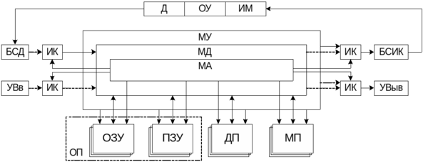 Логическая структура МПС приведена на рис.1.1, где ОУ – объект управления, Д – датчики, ИМ – исполнительные механизмы, ИК – информационные контроллеры, БСД – блок сопряжения с датчиками, БСИК – блок сопряжения с информационными контроллерами, ОП – основная память, ДП – дополнительная память.