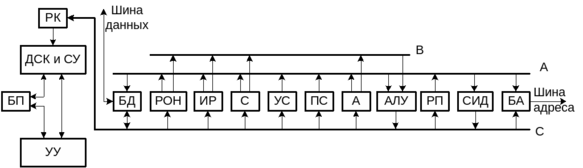 В общем случае в состав МП входят (рис. 1.3): арифметико-логическое устройство (АЛУ), блок прерываний (БП), дешифратор команд и схема управления (ДСК и СУ), регистр команд (РК), буферы адреса и данных (БА, БД), регистры общего назначения (РОН), индексный регистр (ИР), стек (С), его указатель (УС), программный счетчик (ПС), регистр-аккумулятор (А), регистр признаков (РП), схема инкремент-декремент (ИД), блок прерываний (БП).