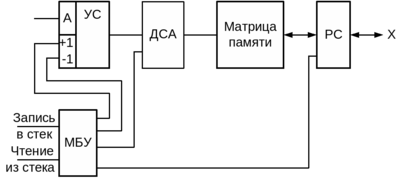 Выборка одной из ячеек матрицы памяти осуществляется через дешифратор адреса (ДСА) по адресу, находящемуся на реверсивном счетчике адреса, называемом указателем стека (УС). Начальное значение адреса поступает в УС на вход А. В процессе работы состояние УС при каждой записи уменьшается, а при каждом чтении увеличивается на единицу. Управление режимами записи и чтения выполняет местный блок управления (МБУ).