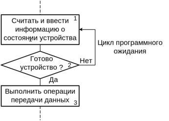 МП может находиться в режиме программного ожидания (готовности) внешнего устройства, выполняя команды блоков 1 и 2. После обнаружения состояния готовности МП передает данные по командам блоку 3, а затем приступает к работе по продолжению основной программы.