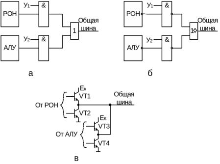 При использовании магистральной организации МПС возникает сложность в подключении выходов нескольких элементов к одной шине (к одному проводнику общей шины). Известны три следующих способа решения этой задачи.