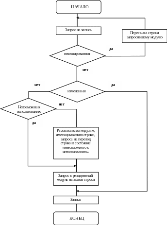 Если процессор выполняет операцию записи и состояние строки, в которую производится запись "измененная", то запись выполняется и вычисления продолжаются. Если состояние строки "невозможная к использованию" или "разделяемая", то модуль посылает в резидентный для строки модуль запрос на захват в исключительное использование этой строки и приостанавливает выполнение записи до получения подтверждений, что все остальные модули, разделяющие с ним рассматриваемую строку, перевели ее копии в состояние "невозможная к использованию".
