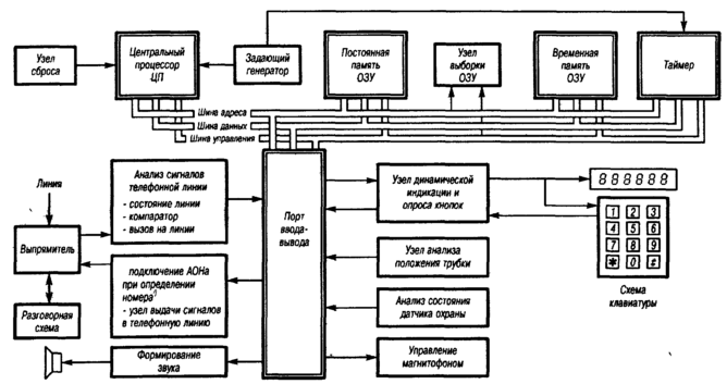 При поднятии и опускании телефонной трубки срабатывает датчик положения телефонной трубки и ЦП становится известно об этом факте. Далее ЦП, в соответствии с программой, решает: подключить телефон и его разговорную схему к линии или выполнить другое действие.