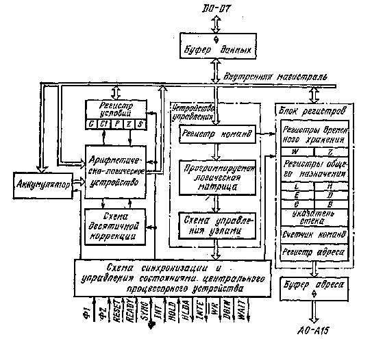 Блок регистров производит прием, хранение и выдачу различной информации, участвующей в процессе выполнения программы, и содержит счетчик команд, указатель стека, регистры общего назначения, регистры временного хранения и регистр адреса. Шестнадцатиразрядный счетчик команд хранит текущий адрес команды. Содержимое счетчика команд автоматически увеличивается после выборки каждого байта команды. Шестнадцатиразрядный указатель стека содержит начальный адрес памяти, используемый для хранения и восстановления содержимого программно-доступных регистров ЦПУ, Содержимое указателя стека уменьшается, когда данные загружаются в стек, и увеличивается, когда данные выбираются из стека. Восьмиразрядные регистры общего назначения В, С, D, Е, Н, L могут применяться как накопители (обрабатываемые данные находятся в самом регистре) и указатели (16-разрядный адрес операнда определяется