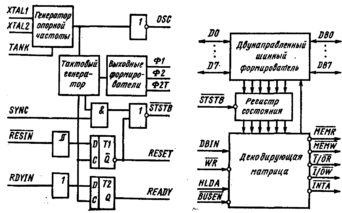 Выход генератора опорной частоты выведен на внешний вывод OSC и соединен внутри микросхемы со счетчиком-делителем, входящим в состав .тактового генератора. Тактовый генератор состоит из счетчика-делителя на 9, логических дешифраторов, формирующих требуемые тактовые импульсы, выходных формирователей и вспомогательных логических схем и триггеров для генерации выходных сигналов: Ф1.Ф2.Ф2Т, STSTB, Тактовые импульсы Ф1 и Ф2 управляют МОП-входами микропроцессора КР580ВМ80А. Тактовый импульо Ф2Т используется для управления ТТЛ-входами в режиме прямого обращения к памяти.