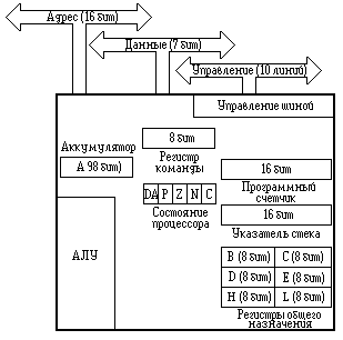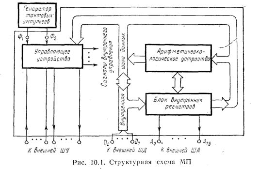 В состав МП (рис. 1) входят арифметическо-логическое устройство, устройство управление и блок внутренних регистров.
