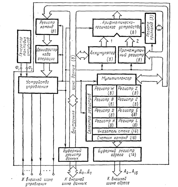 Обмен информацией между регистрами и другими блоками микропроцессора производится через внутреннюю шину данных, причем передачи команд и данных разделены во времени. Связь с внешней шиной данных осуществляется через буферный регистр данных.