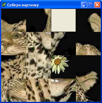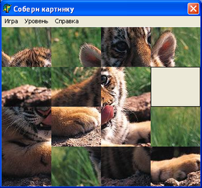 Процедура Formmas формирует массив клеток игрового поля. NewGame позволяет загружать картинку ‘pic_1.bmp’ из внешнего растрового файла, если при обращении к файлу происходит ошибка, то форма закрывается. Также при выполнении этой процедуры устанавливается размер формы, равный размеру картинки. Картинка разрезается на фрагменты, которые перемешиваются (процедура Mixer стр.20) и отображаются на форме (процедура ShowPole стр.19). Для перемешивания 150 раз случайным образом выбирается фрагмент изображения, находящийся рядом с пустой клеткой и перемещается в эту пустую клетку. Для отображения фрагментов на форме задаются прямоугольные области, на канву которых копируются части изображения. Форма приобретает вид: