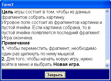 Эта процедура выводит на экран форму Form3 и помещает на ее компонент RichEdit содержимое текстового файла „ Правила ”. Форма принимает вид: