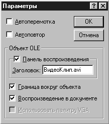 араметры, которые можно установить для "Универсального проигрывателя", зависят от типа объекта мультимедиа. Для установки параметров объекта или устройства мультимедиа нужно выбрать из меню команды Правка, затем Параметры для файла Видео для Windows. На рис. 4 показано диалоговое окно Параметры для файла Видео для Windows.