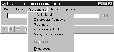 Для работы с файлами мультимедиа или звуковыми компакт-дисками нужно открыть "Универсальный проигрыватель" и выбрать из меню команду Устройство, затем выбрать из открывшегося подменю устройство мультимедиа или тип файла. Для проигрывания видеоклипов, следует выбрать устройство Видео для Windows. Для того, чтобы проигрывать звуковые компакт-диски, нужно выбрать устройство Аудио компакт-диск.