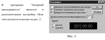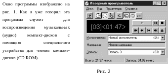 Для того чтобы начать воспроизведение аудио компакт-диска необходимо открыть программу "Лазерный проигрыватель", вставить в привод CD-ROM'а диск и нажать кнопку "Play". Во время проигрывания в окне программы отображается информация касающаяся протяженности записи всего компакт-диска, длины воспроизводимого трека в минутах (нижняя строка). Также в окне "Лазерного проигрывателя" имеется черное табло, на котором (по умолчанию) показывается выбранный трек и какое время он проигрывается. Есть три режима работы данного циферблата. Эти режимы можно изменять путем клика левой кнопки мышки в области данного табло. При первом нажатии кнопки мышки, данное табло будет отображать время оставшееся до конца воспроизводимого трека; при втором – время оставшееся до конца воспроизведения всех треков, т.е. всего компакт-диска; при третьем – табло программы возвращается в исходное состояние.
