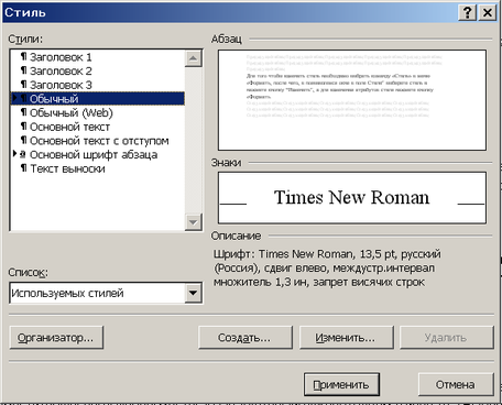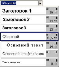 Стили в Microsoft Word значительно облегчают работу при форматировании документа. Стиль — это именованный и сохраненный набор параметров форматирования. Стили могут включать гарнитуру и размер шрифта, межстрочный интервал, отступы, величину абзаца и пр. Они позволяют, задав один раз необходимые параметры, пользоваться ими все время. Если, скажем, при написании рефератов вы всегда используете шрифт "Times New Roman", кегль 13,5 и межстрочный интервал 1,3, вовсе не обязательно каждый раз выставлять эти настройки. Достаточно создать стиль и выбирать его, когда это будет необходимо. Форматировать текст с помощью стиля намного быстрее, чем изменять вручную каждый элемент форматирования, к тому же при этом гарантируется единообразие внешнего вида определенных элементов документа. Если позже вы внесете изменения в определенный стиль, весь текст документа, к которому был применен этот стиль, изменится в соответствии с новым определением стиля. Наиболее часто используемыми стилями (конечно же, кроме Обычного) являются стили заголовков (headers). Особенность их в том, что, если абзацу присвоен один из стилей заголовков, следующему автоматически будет присвоен стиль Обычный. В программе всего девять таких стилей, и в каждом следующем размер шрифта меньший, чем в предыдущем. Таким образом, используя эти стили, можно структурировать текст и выделять заголовки по степени их значимости.
