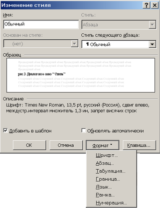 В этом окне в списке ”Формат” можно выбрать изменяемые элементы: шрифт, границы, язык, рамку, нумерацию, параметры абзаца и табуляции, а в поле “Стиль следующего абзаца” можно задать стиль последующего абзаца.