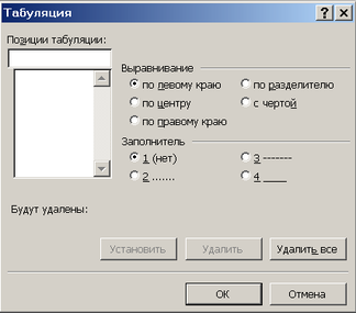 диалоговом окне “Табуляция” можно установить выравнивание табуляции и ее заполнитель: