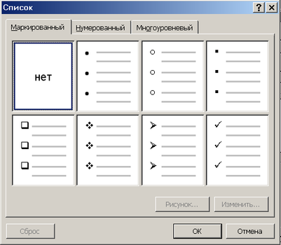 ри нажатии “Нумерация” появляется диалоговое окно “Список”. Такое же диалоговое окно появляется при выборе команды Формат – Список. Это окно содержит три вкладки с типами списков: маркированный, нумерованный и многоуровневый.