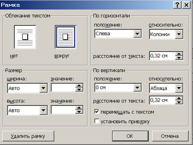 1. Диалоговое окно “Рамка” появится при нажатии “Рамка”. В нем при желании можно задать рамку, обтекание ее текстом, положение по горизонтали и вертикали и размер: