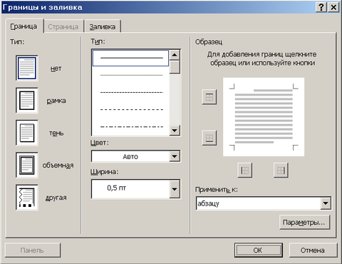1. При нажатии “Граница” появляется диалоговое окно “Границы и заливка”: