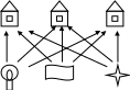 Другая старая топологическая задача, которая особенно долго не поддавалась решению и будоражила умы любителей головоломок, известна как “задача об электро -, газо - и водоснабжении”. В 1917 году Генри Э.Дьюдени дал ей такую формулировку. В каждый из трёх домов, изображенных на рисунке, необходимо провести газ, свет и воду.