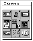 Передняя панель VI - прежде всего комбинация средств управления и индикаторов. Средства управления моделируют реальные устройства ввода данных и обеспечивают их поступление в блок-схему VI. Индикаторы, моделируют реальные устройства вывода, которые отображают данные, полученные на выходе блок-схемы VI.Вы добавляете средства управления и индикаторы на переднюю панель, выбирая их из т.н. “всплывающей палитры средств управления”(из списка имеющихся в наличии компонент), показанной на рис.2: