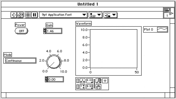 Интерактивный интерфейс пользователя VI назван Передней Панелью, потому что он моделирует панель реального прибора. Передняя панель может содержать кнопки, переключатели, индикаторы, диаграммы, графики, и другие средства отображения и управления. Вы вводите данные, используя мышь и клавиатуру (имитируя действия с реальной передней панелью ) , и затем просматриваете результаты на экране компьютера.